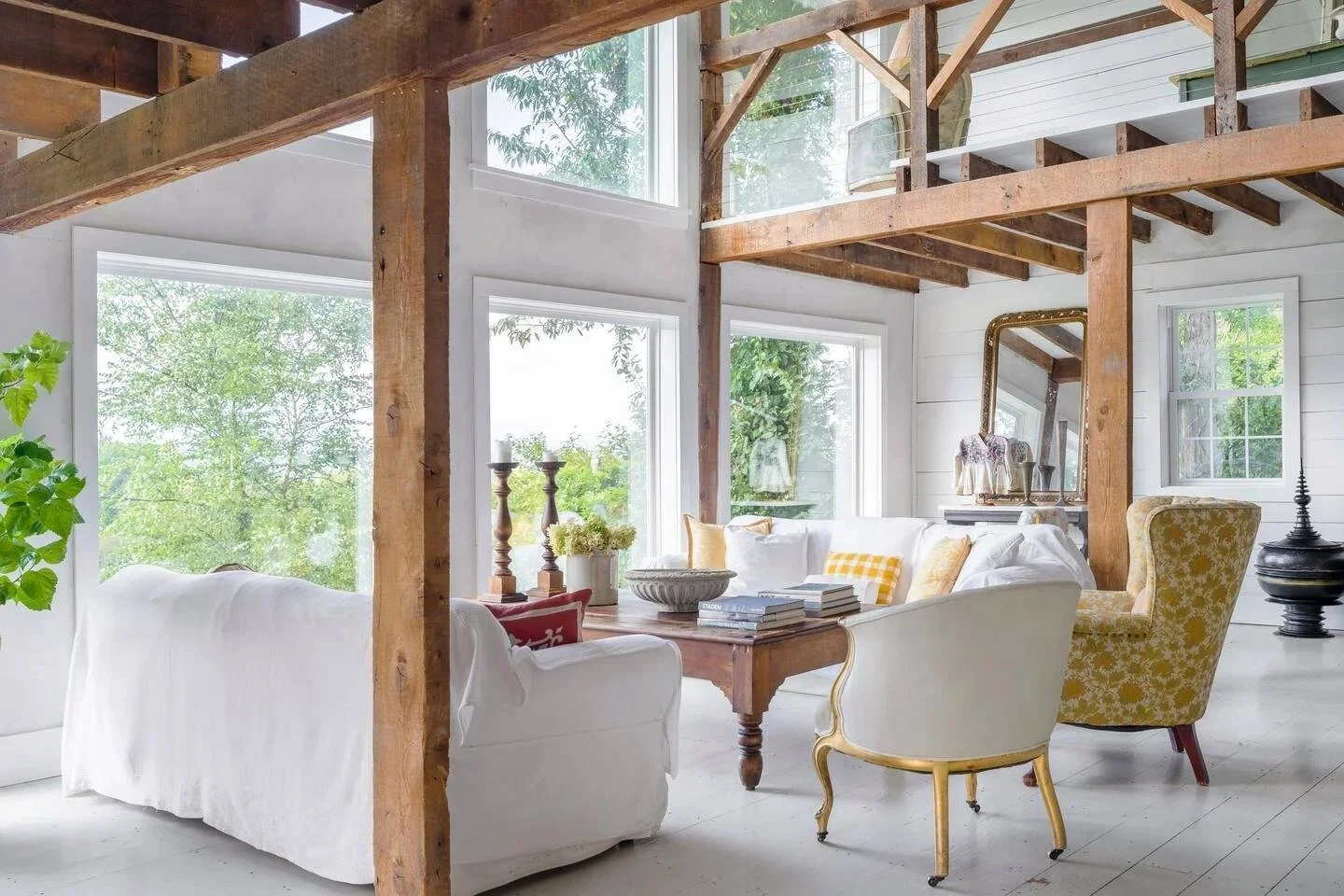 High ceilings, an open loft sleeping area, antique details, and a private pond create a setting for slow mornings, long walks, and unhurried days.