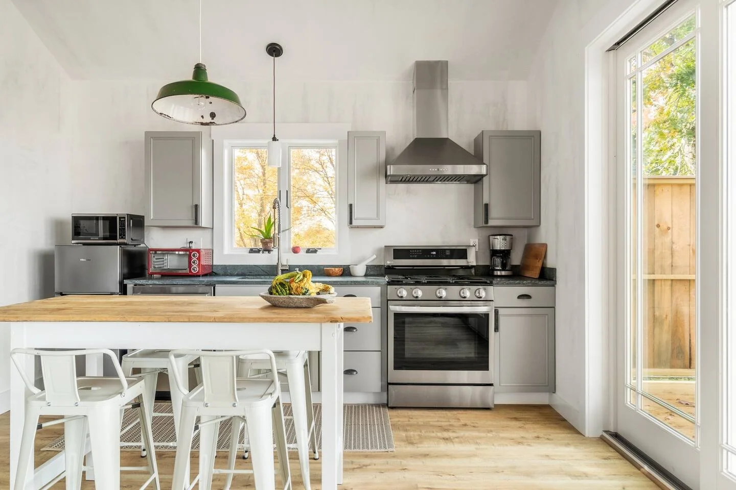 High ceilings, plaster walls, warm light, and large windows create a calm, refined retreat. Includes a private deck and a modern kitchen.