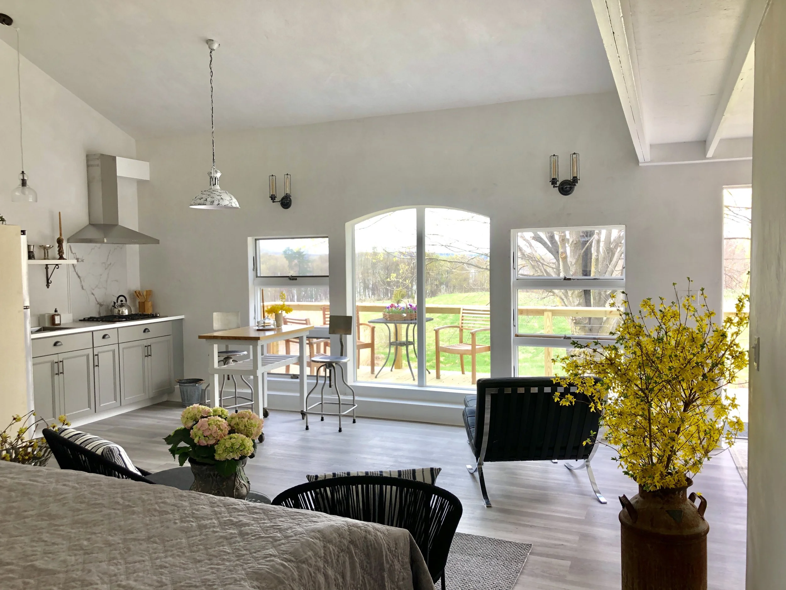 “This tastefully designed oversized studio has big windows looking out at gorgeous views, and there’s easy walking paths through lush greenery and purple and yellow wildflowers. We used the grill on our deck, relaxed on the hammock and thoroughly enjoyed the peace and sunsets each night. Perfect pied a terre for a getaway in the area with lots of arts and cultural things to do.”
